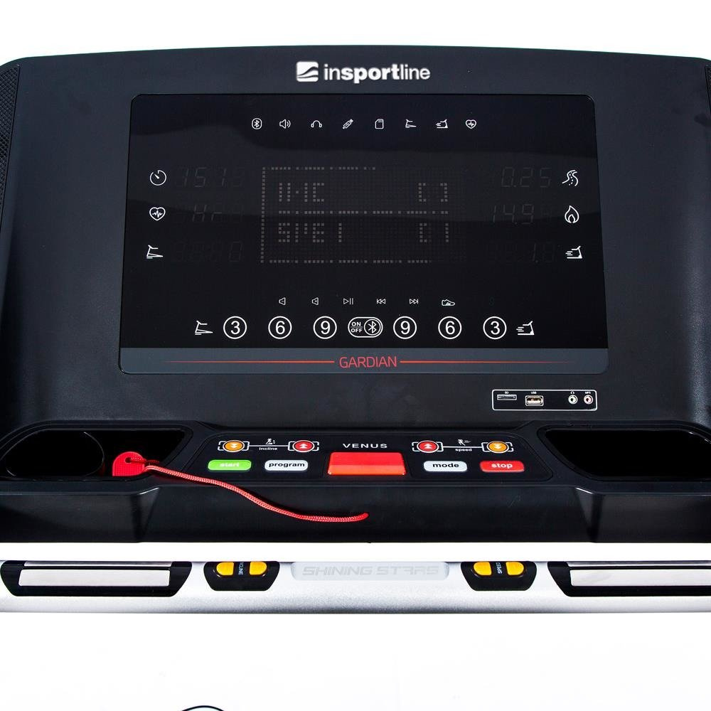 W pamięci wbudowanego komputera bieżni Insportline Gardian G12 zapisano aż 24 gotowe programy, 2 programy użytkownika i 3 programy HRC, które działają na podstawie tętna biegacza, rejestrowanego przez wbudowane w uchwyt czujniki (50-140 BPM - uderzeń na minutę). Duży, czytelny wyświetlacz (21,6'') wskazuje wszystkie niezbędne informacje ( czas, prędkość, nachylenie, dystans, tętno i spalone kalorie). Prędkość i nachylenie pasa można łatwo regulować za pomocą przycisków sterujących umieszczonych na wyświetlaczu. Ponadto, bieżnia jest wyposażona w funkcjonalne gadżety, takie jak: port USB, odtwarzacz MP3 z głośnikami, wejście słuchawkowe oraz gniazdo do kart pamięci.
