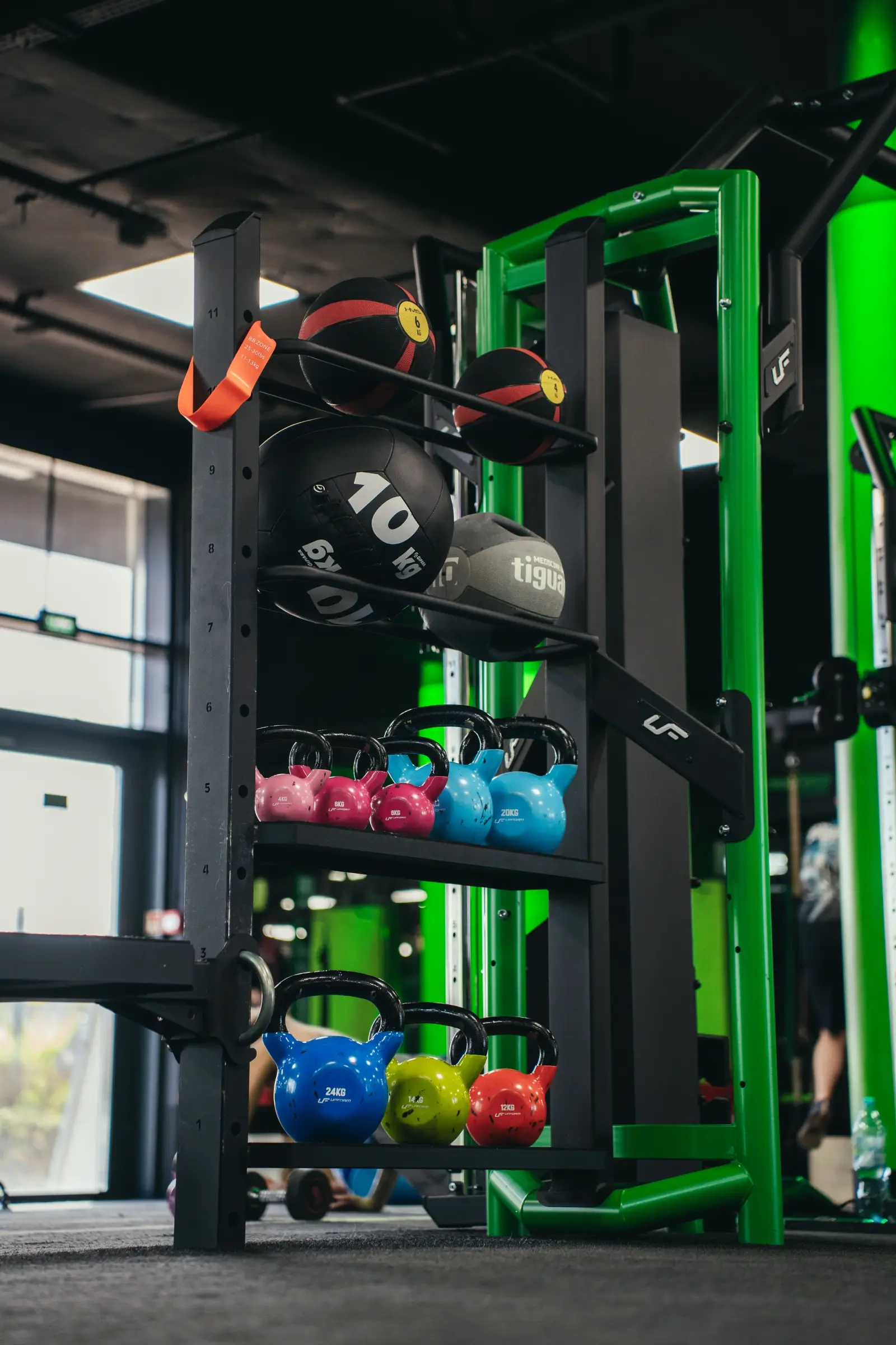 Stacja posiada cztery półki na akcesoria, po dwie na piłki i hantle kettlebell.