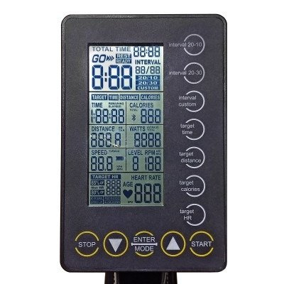 Konsola śledzi odległość, prędkość, tempo, spalone kalorie oraz tętno. Możesz zaprogramować swój własny trening interwałowy lub po prostu rozpocząć trening, podczas gdy konsola śledzi wszystkie istotne pomiary. Konsola wyświetla również poziom oporu magnetycznego.