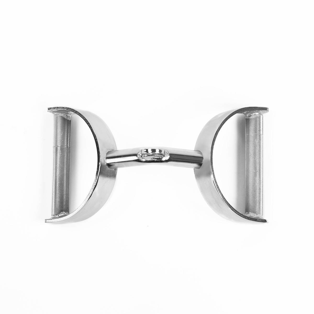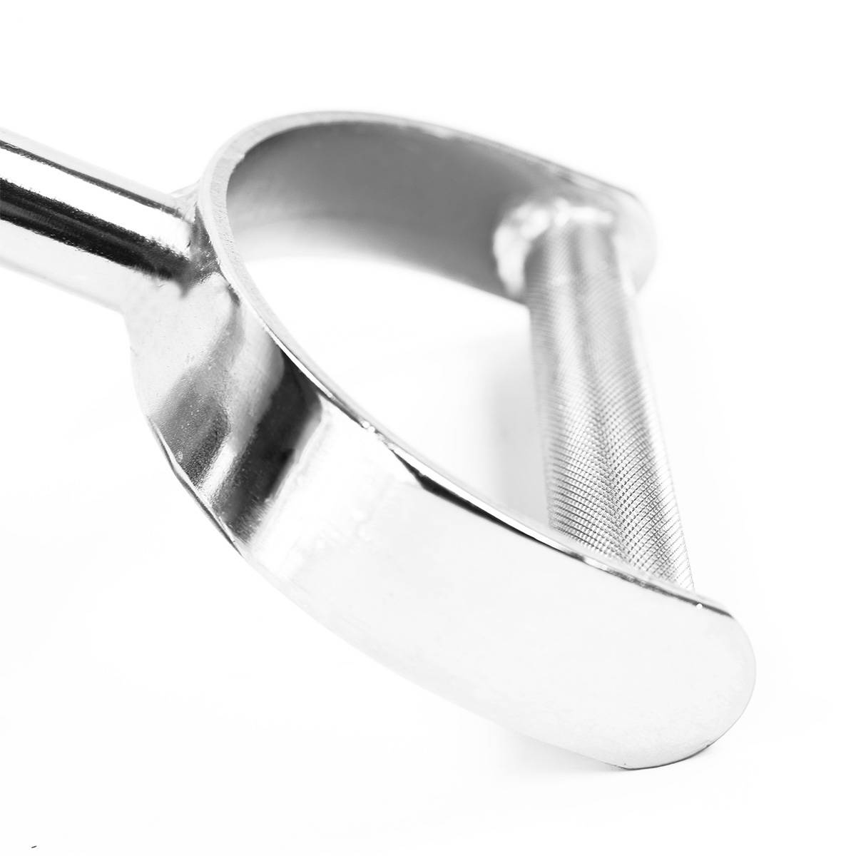 Budowa uchwytu gwarantuje idealne ułożenie dłoni oraz wymusza prawidłowy ruch. Szeroki rozstaw rękojeści umożliwia wykonywanie ćwiczeń pod alternatywnym kątem do uchwytu wąskiego. Daje to możliwość efektywniejszego treningu oraz pełnego rozwoju grupy mięśniowej. Stalowa, chropowata rękojeść zapobiega wyślizgnięciu się przyboru z rąk, jednocześnie wymagając od nas mocniejszego chwytu. Dzięki temu pracujemy także nad rozbudową mięśni przedramienia. Uchwyt wykonany jest z wysokiej jakości stali. Pozwoli to na trening ze znacznym obciążeniem.