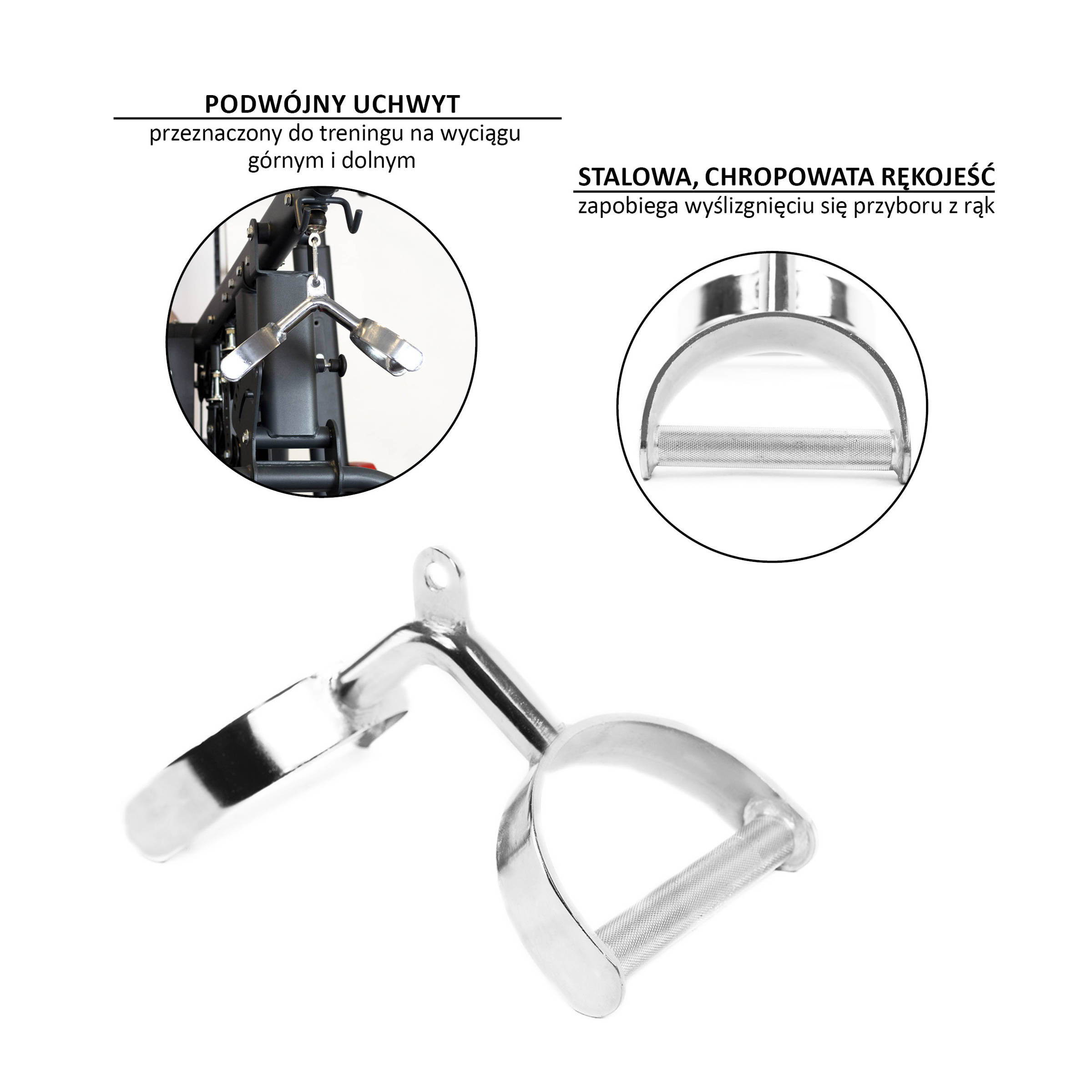 UW08 HMS to podwójny uchwyt przeznaczony do treningu na wyciągu górnym i dolnym. Służy głównie do ćwiczenia mięśni grzbietu. Jego kształt pozwala na obszerniejszy zakres ruchu niż przy prostym czy wąskim chwycie. Umożliwia także mocniejsze napięcie mięśnia, przez co nasz trening będzie skuteczniejszy.