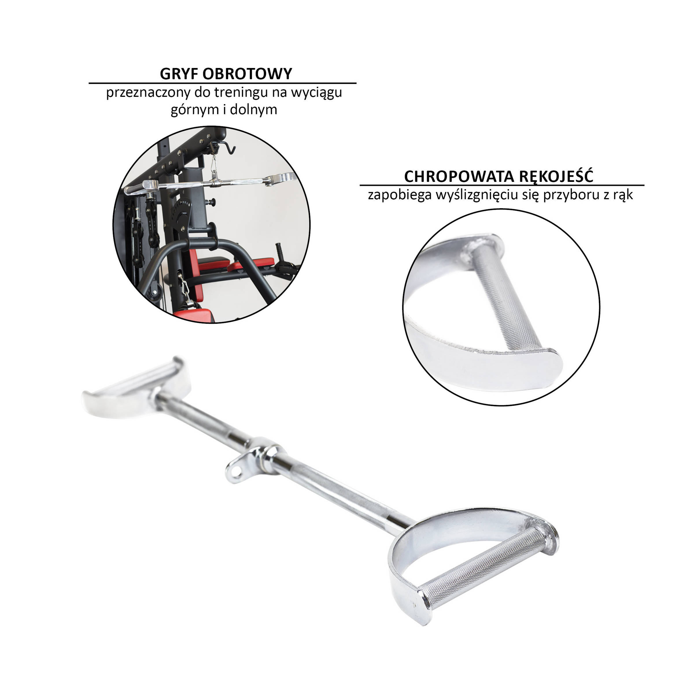UW16 HMS to gryf obrotowy przeznaczony do treningu na wyciągu górnym i dolnym. Można wykorzystać go do całej gamy ćwiczeń na różne grupy mięśniowe górnych partii ciała, zaczynając od małych grup mięśniowych, jak biceps i triceps, przez przedni i boczny akton mięśni naramiennych, aż po mięśnie najszersze i prostownik grzbietu.