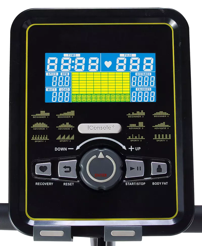 czas, dystans, prędkość, RPM, kalorie,puls, Body Fat, Recovery
