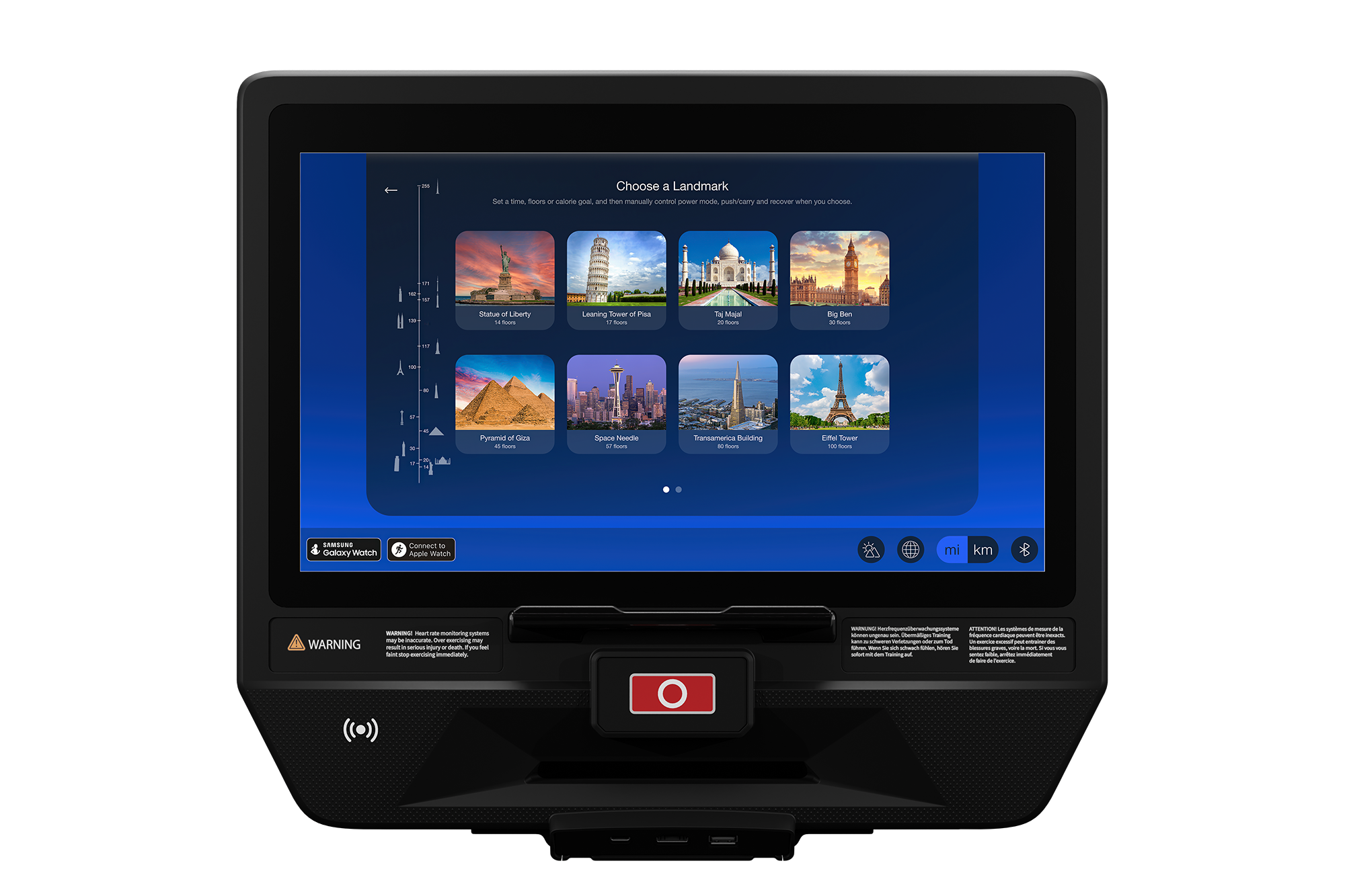 Program Landmark Challenge: Urozmaicaj sesje cardio dzięki programowi Landmark Challenge, który pozwala wirtualnie wspinać się na słynne obiekty, takie jak Wieża Eiffla, Statua Wolności czy Tadż Mahal, czyniąc trening ekscytującym i immersyjnym.