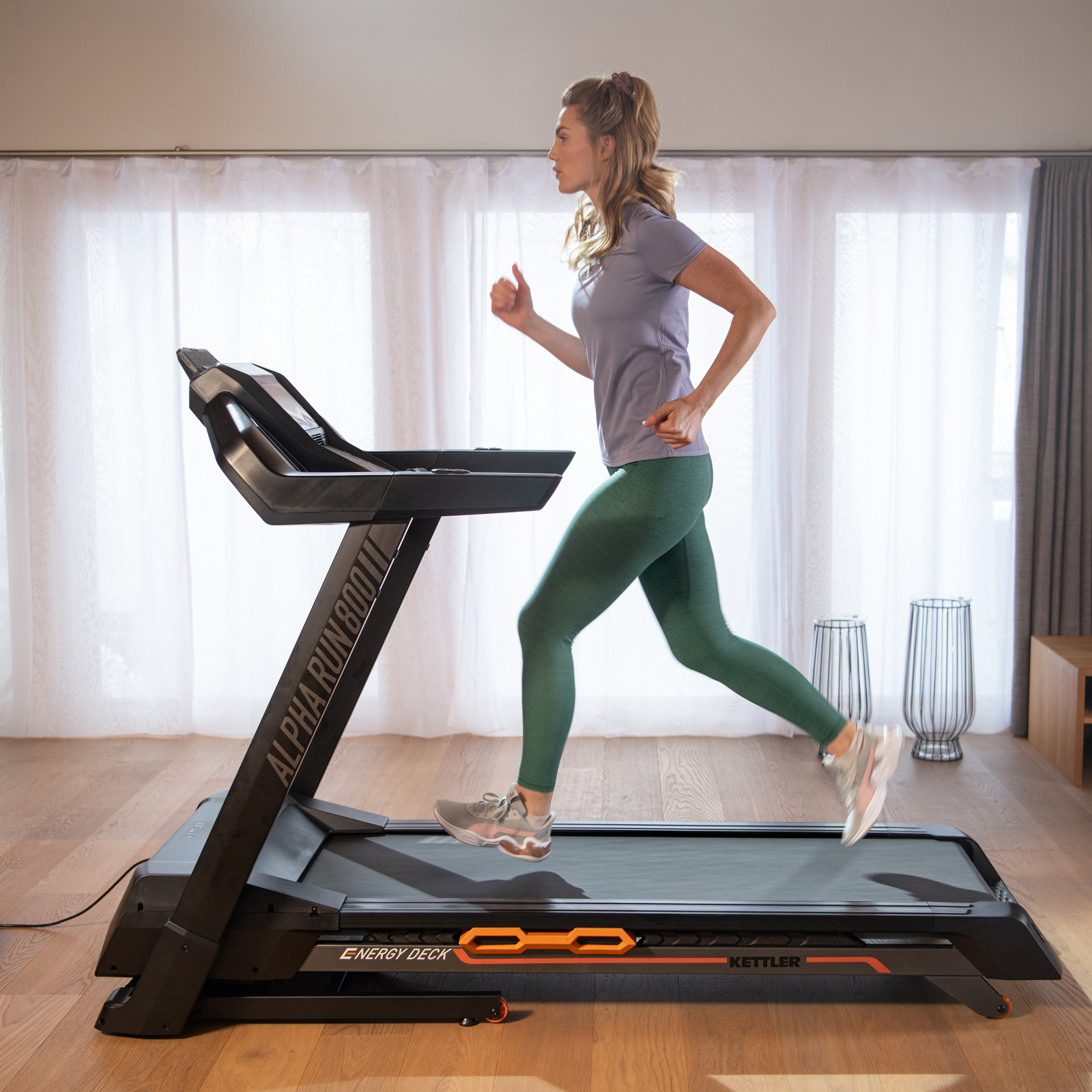 Pas biegowy o wymiarach 153x55 cm zapewnia wystarczająco dużo miejsca na komfortowy trening. Wysokiej jakości system amortyzacji ENERGY DECK sprawia, że trenowanie na bieżni KETTLER ALPHA RUN 800 nie obciąża stawów. Możesz cieszyć się wyjątkowo komfortowym i dynamicznym biegiem. Amortyzacja pochłania energię kinetyczną kroków i przesuwa ją do tyłu.