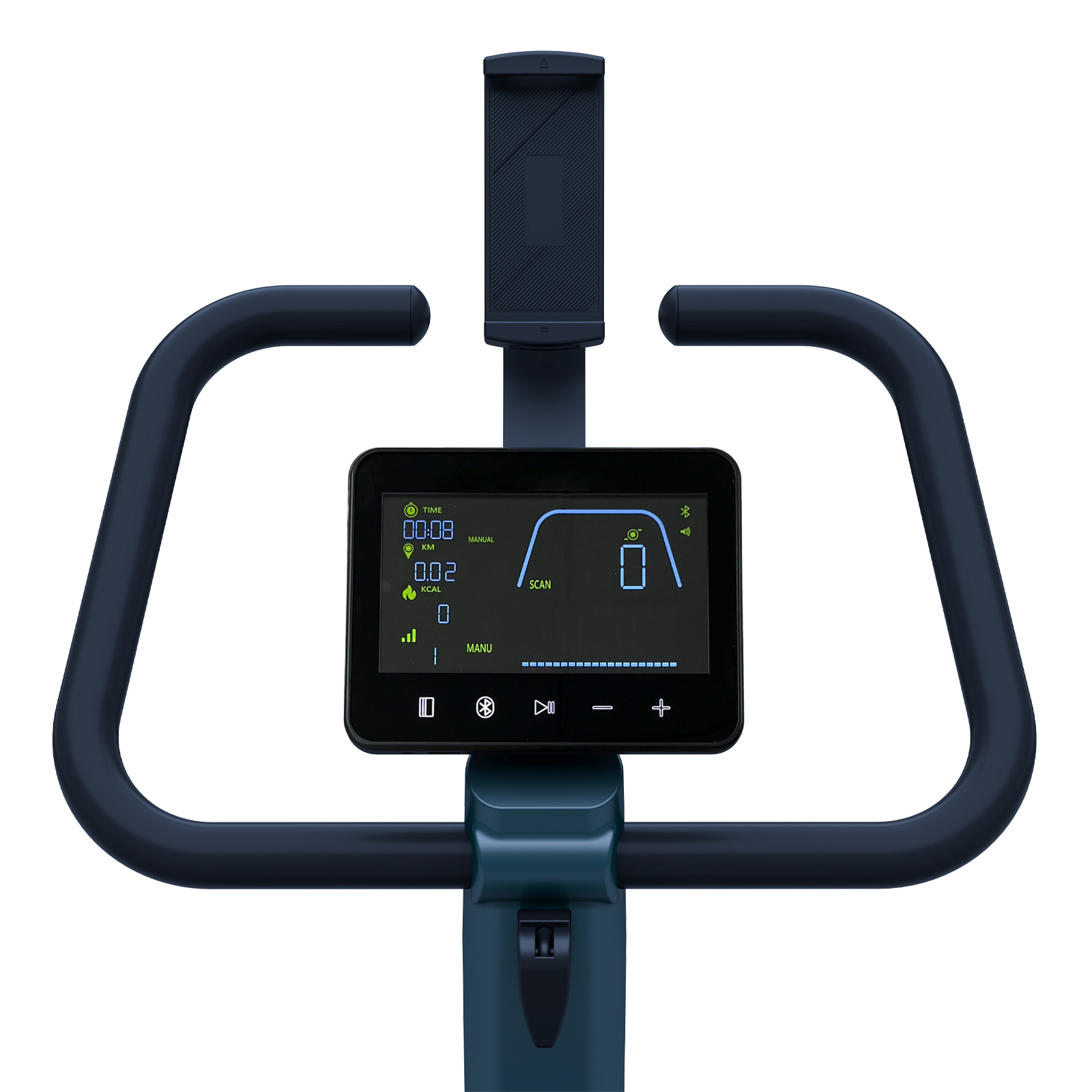 Wygoda w zasięgu ręki - uchwyt na tablet i smartfon Rower wyposażono w stabilny uchwyt na tablet i smartfon, umieszczony w optymalnym miejscu nad wyświetlaczem. Masz dostęp do ulubionej muzyki, filmów czy seriali.