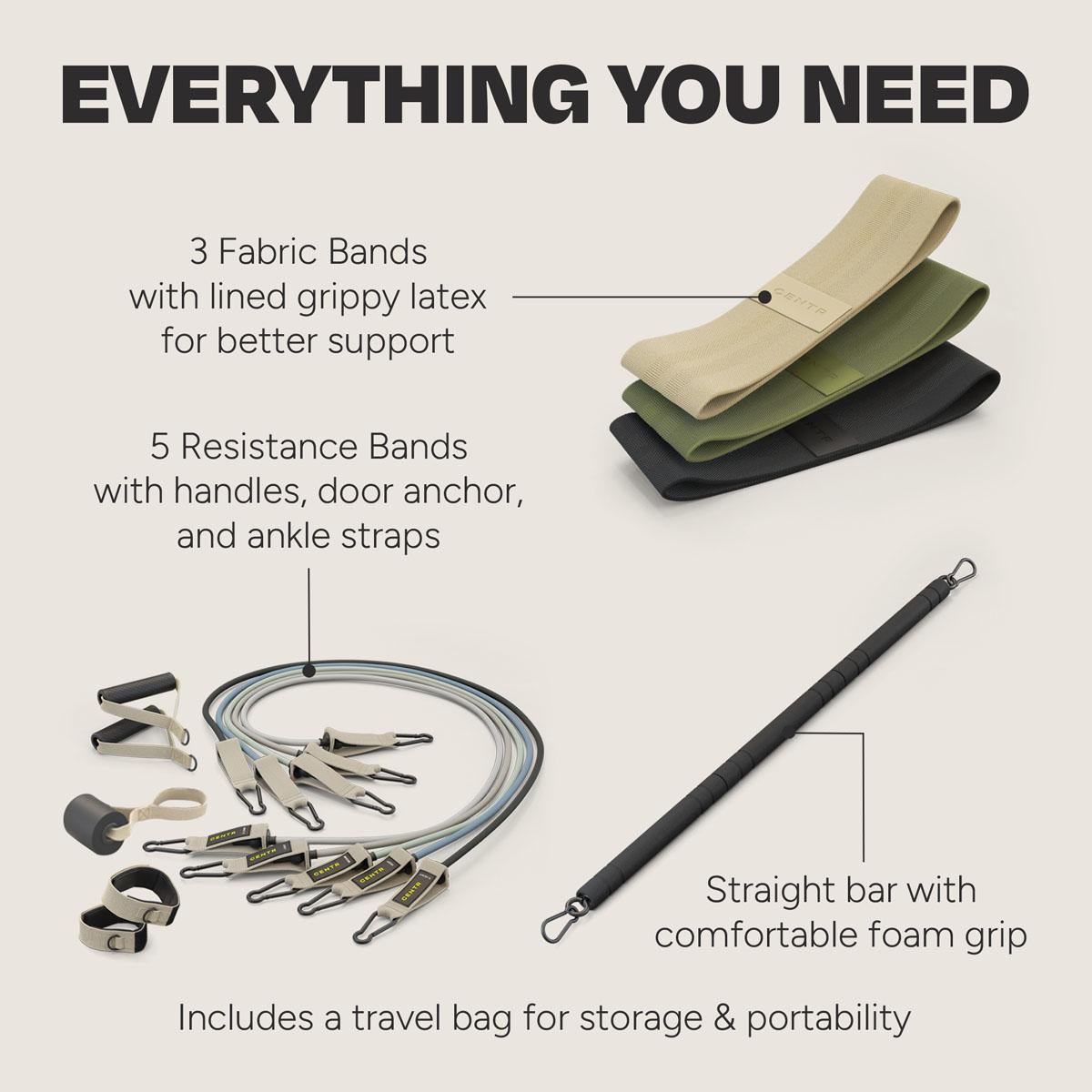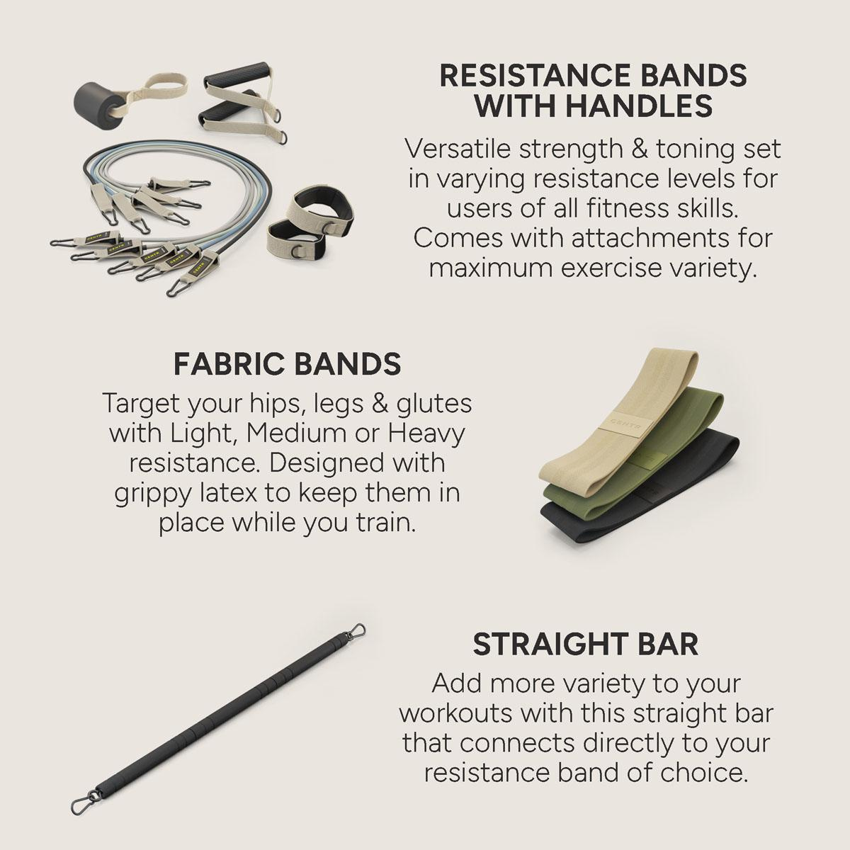 Centr Workout Kit – mobilny zestaw do treningu siłowego Zestaw Centr Workout Kit to wszystko, czego potrzebujesz do budowy siły, modelowania sylwetki i urozmaiconego treningu oporowego – niezależnie od miejsca. Komplet zawiera różne poziomy oporu oraz wszechstronne akcesoria umożliwiające ćwiczenia pchania, ciągnięcia i stabilizacji.