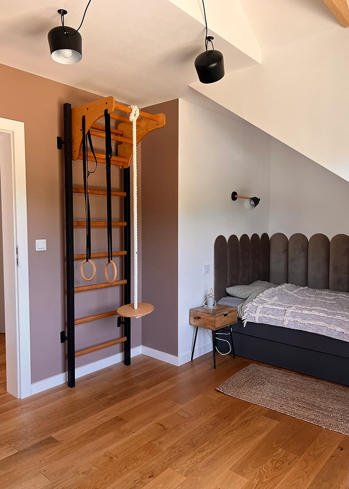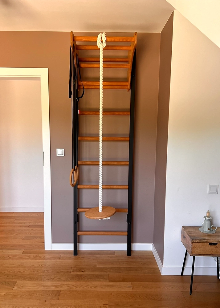 Drabinka gimnastyczna dla dzieci składa się z zdejmowalnego drewnianego drążka do podciągania, kółek gimnastycznych oraz liny do wspinania z huśtawką (osprzęt kompatybilny tylko z drabinkami BenchK). Z powodzeniem może zastąpić ściankę wspinaczkową, od której jest znacznie bardziej wielofunkcyjna. Maksymalna waga użytkownika drabinki BenchK 211B+A076 to aż 120 kg, dzięki czemu korzystać z niej mogą właściwie wszyscy członkowie rodziny.