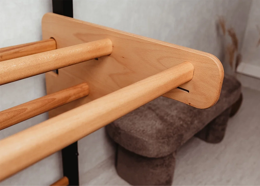 Na drabince gimnastycznej BenchK 211B+A076 może ćwiczyć cała rodzina. Jest bardzo łatwa w montażu, trwała i bezpieczna. Nie zajmuje dużo miejsca, a jej design przemyślano tak, aby drabinka była ciekawym elementem wystroju każdego pokoju. Szczeble wykonane z litego drewna bukowego nie są lakierowane a są ręcznie olejowane dwoma warstwami organicznego oleju, na bazie oleju lnianego który jest dopuszczalny do kontaktu z żywnością, w połączeniu z czarnymi metalowymi elementami tworzą stylowy mebel.