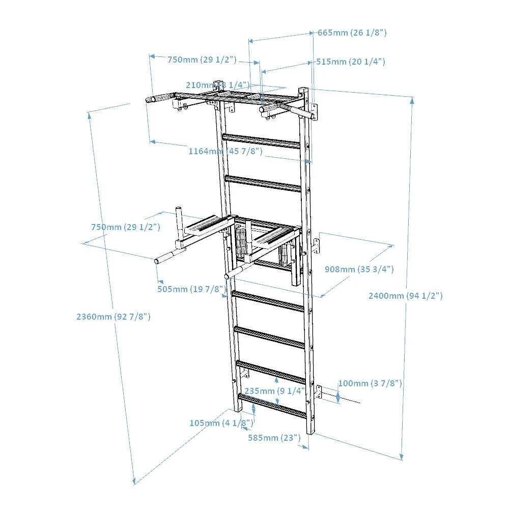 Dziewięć bukowych szczebelków drabinki jest ręcznie olejowanych dwoma warstwami organicznego oleju, na bazie oleju lnianego który jest dopuszczalny do kontaktu z żywnością. Dzięki wykorzystaniu elementów z naturalnego litego buka udało się stworzyć nowoczesny mebel sportowy, który idealnie pasuje do wnętrz domów, mieszkań, stref relaksu biur.