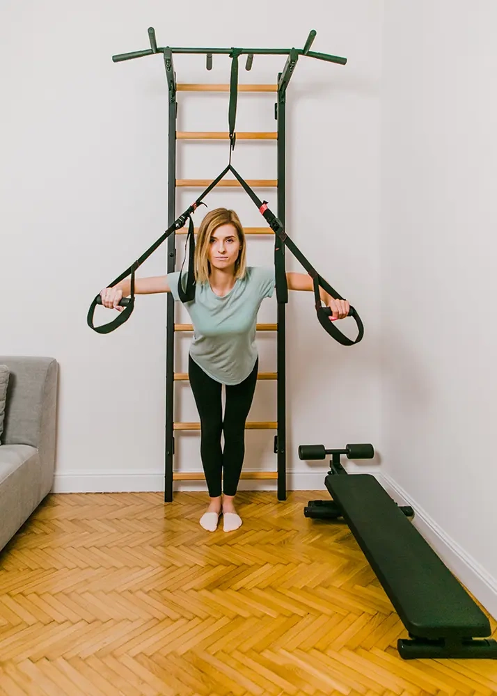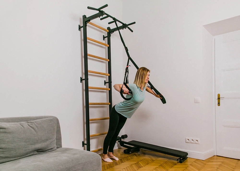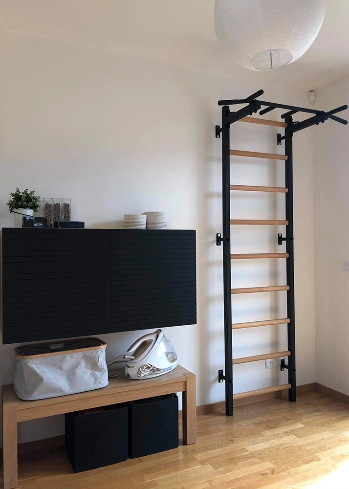 Połączenie bukowego drewna z metalem tworzy idealny, stylowy mebel sportowy do nowoczesnej przestrzeni mieszkaniowej albo biurowej. Drabinkę gimnastyczną można wyposażyć w dodatkowy osprzęt, tworząc w taki sposób rozbudowaną domową siłownię na powierzchni 1 m2.